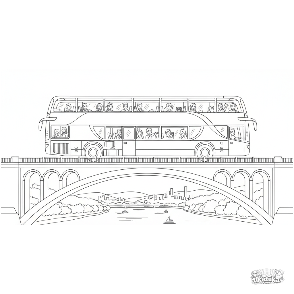 Página para colorear detallada para 10-12 años: un autobús turístico moderno de dos pisos se detiene en un puente pintoresco sobre un río. Muchos elementos para colorear con cuidado.
