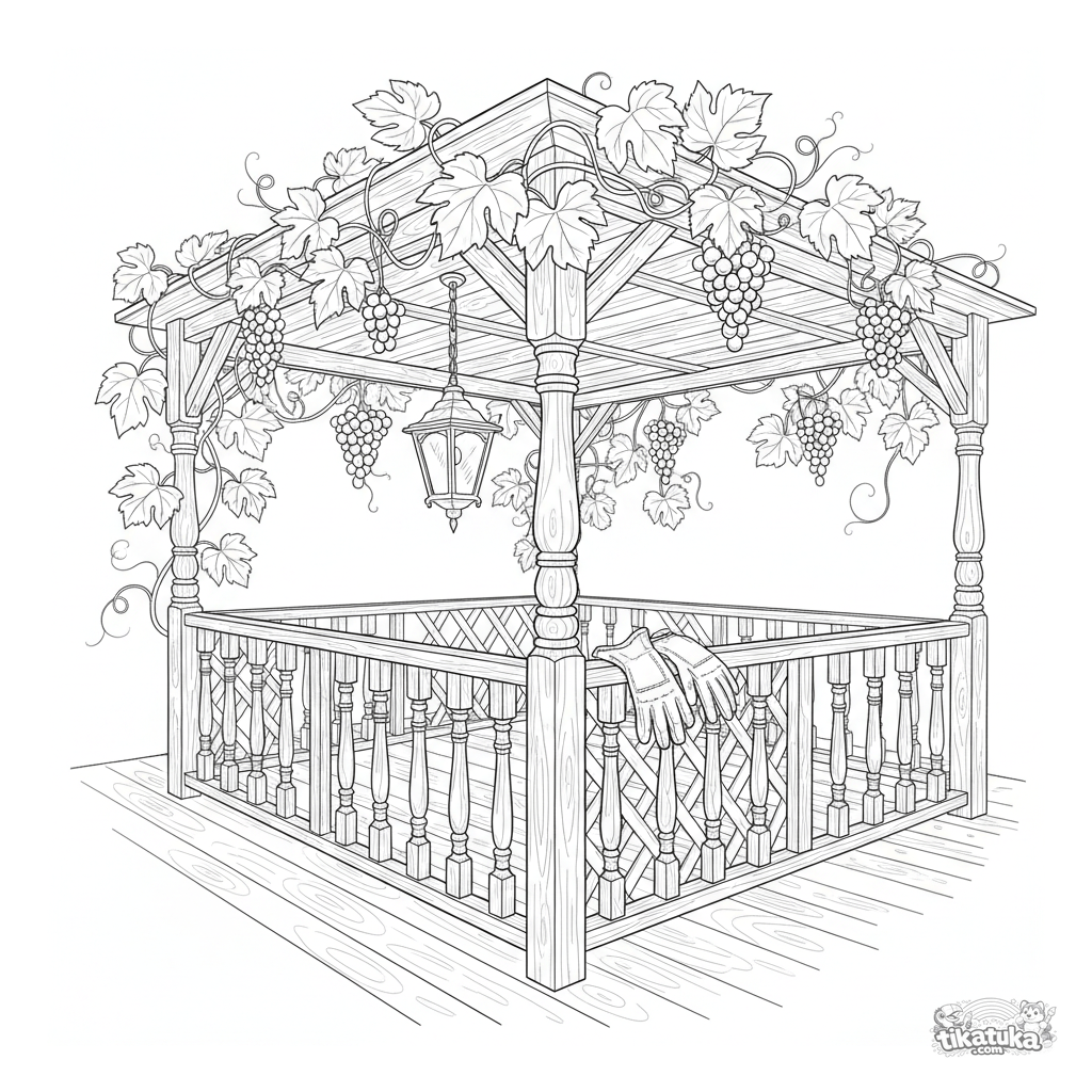 Página para colorear compleja para niños mayores 10-12: un boceto arquitectónico detallado del rincón de una terraza de campo con viñas.
