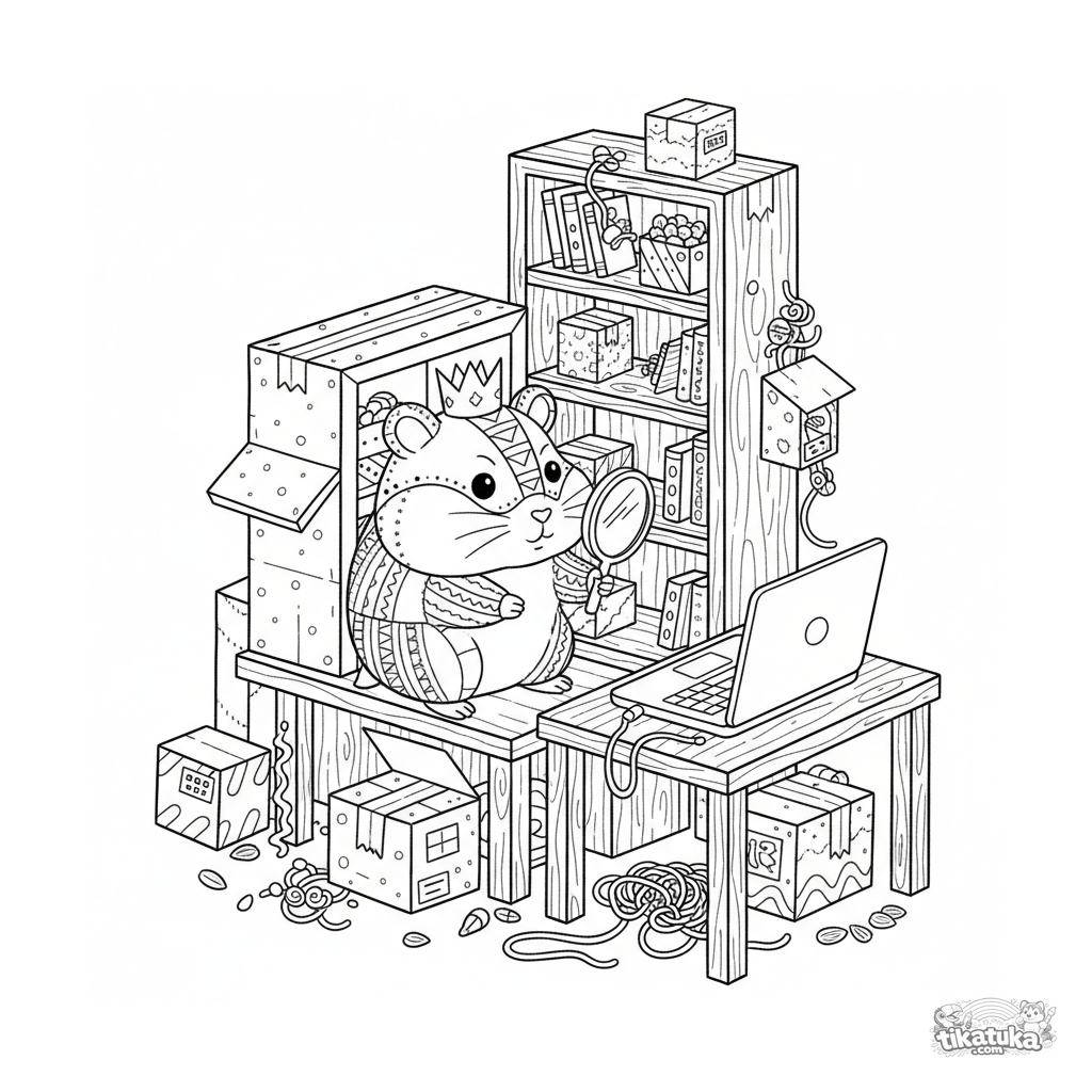 Página para colorear en estilo doodle: un hámster decidido con corona espía un portátil con un espejo desde un fuerte de cartón. Meme divertido y detallado de bricolaje para niños 10-12.