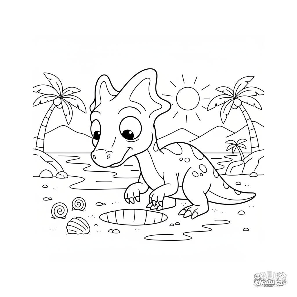 Página para colorear para niños de 4-6 años: un dilophosaurus cava un hoyo en la arena de una playa antigua para encontrar almejas.