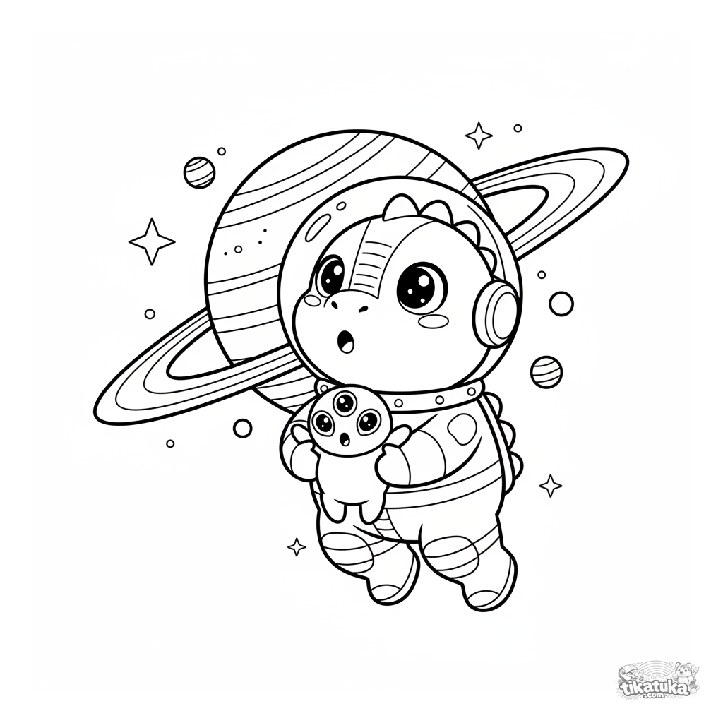 Página para colorear para niños 4-6: el héroe dino explorador en traje espacial flota cerca de un planeta anillado, sosteniendo un alienígena amigable de tres ojos.