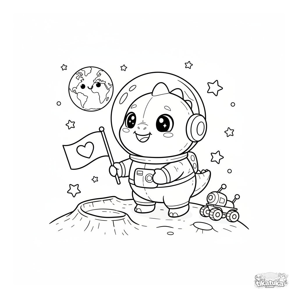 Página para colorear de un dino explorador astronauta plantando una bandera en un cráter lunar. Para niños de 4 a 6 años.