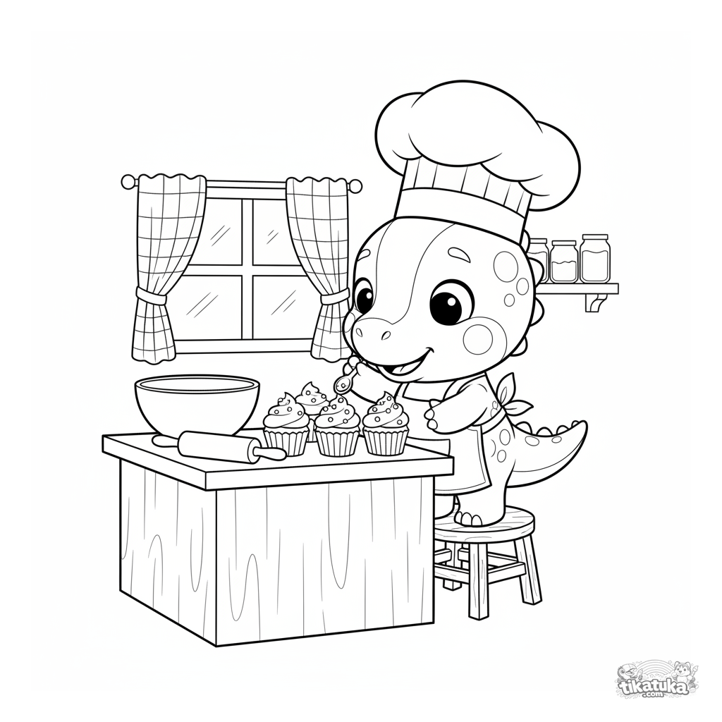Página para colorear para niños 4-8: el héroe dino explorador lleva un gorro de chef y decora magdalenas en un mostrador de cocina acogedor.