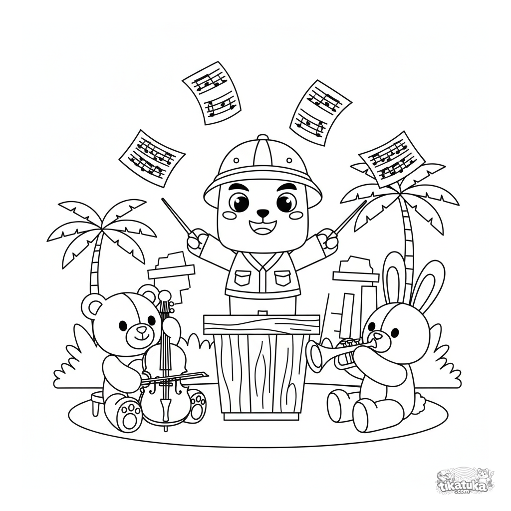Página para colorear para niños 4-6: el héroe dino explorador dirige una orquesta de juguetes de peluche desde un podio pequeño, con partituras flotando.