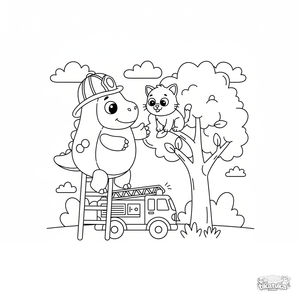 Página para colorear para niños 4-6: el héroe dino explorador con casco de bombero sube por una escalera de árbol para rescatar un gatito asustado.