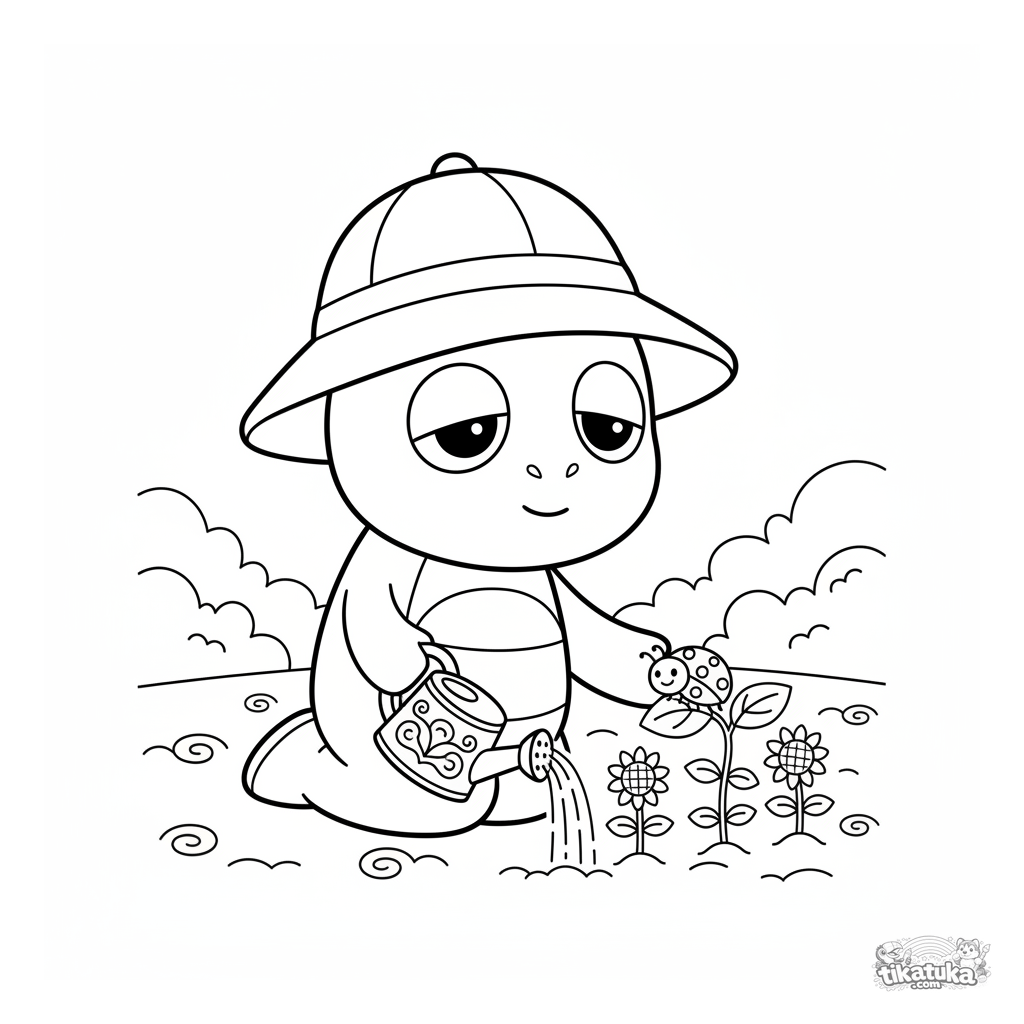 Página para colorear para niños 4-6: el héroe dino explorador con sombrero de jardinero riega pequeñas plántulas de girasol con una regadera, una mariquita cerca.