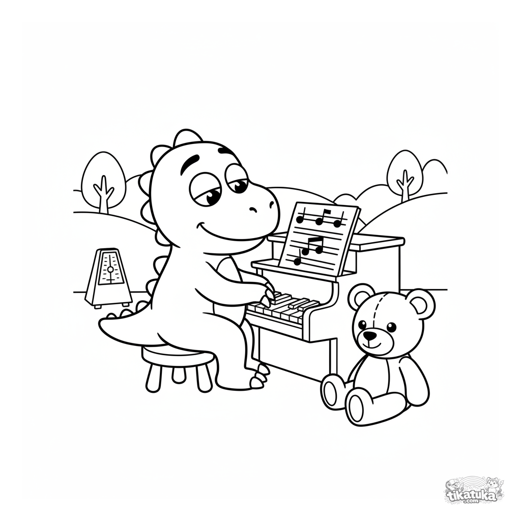 Página para colorear para niños 4-8: el héroe dino explorador aprende a tocar un piano de juguete, mirando cuidadosamente una partitura con notas simples.