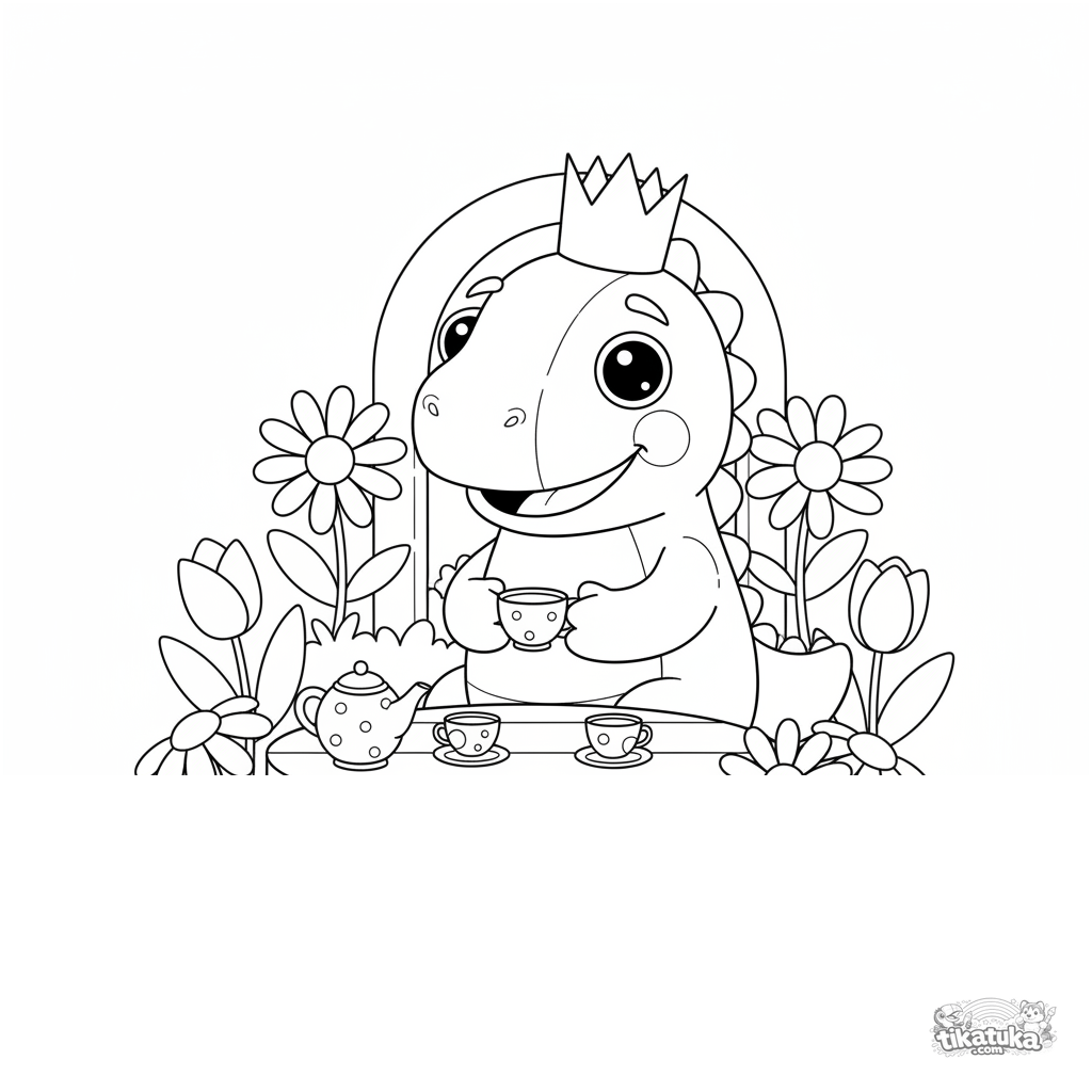 Página para colorear de una dino exploradora princesa en una delicada fiesta de té en un jardín florido. Para niñas de 4 a 6 años.