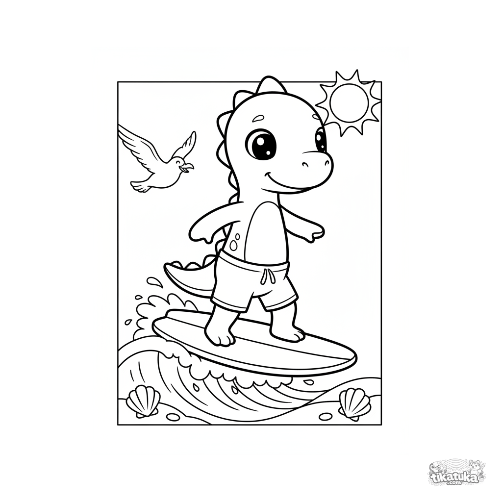 Página para colorear para niños 4-6: el héroe dino explorador en bañador se equilibra en una tabla de surf, montando una pequeña ola espumosa cerca de una playa soleada.