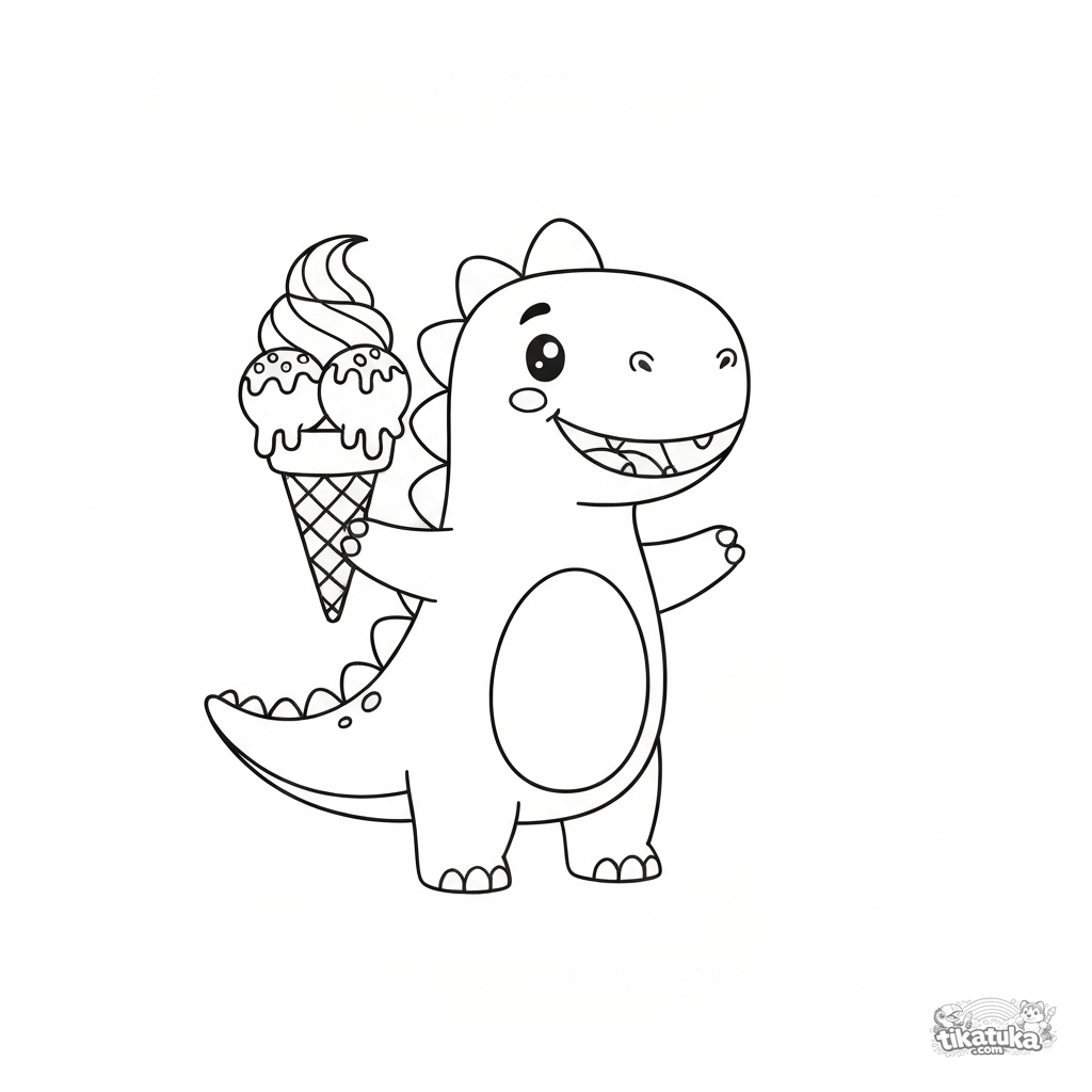 Un dinosaurio lindo y amigable sostiene felizmente un gran helado de cono colorido. Una escena divertida para colorear que les encantará a los niños.