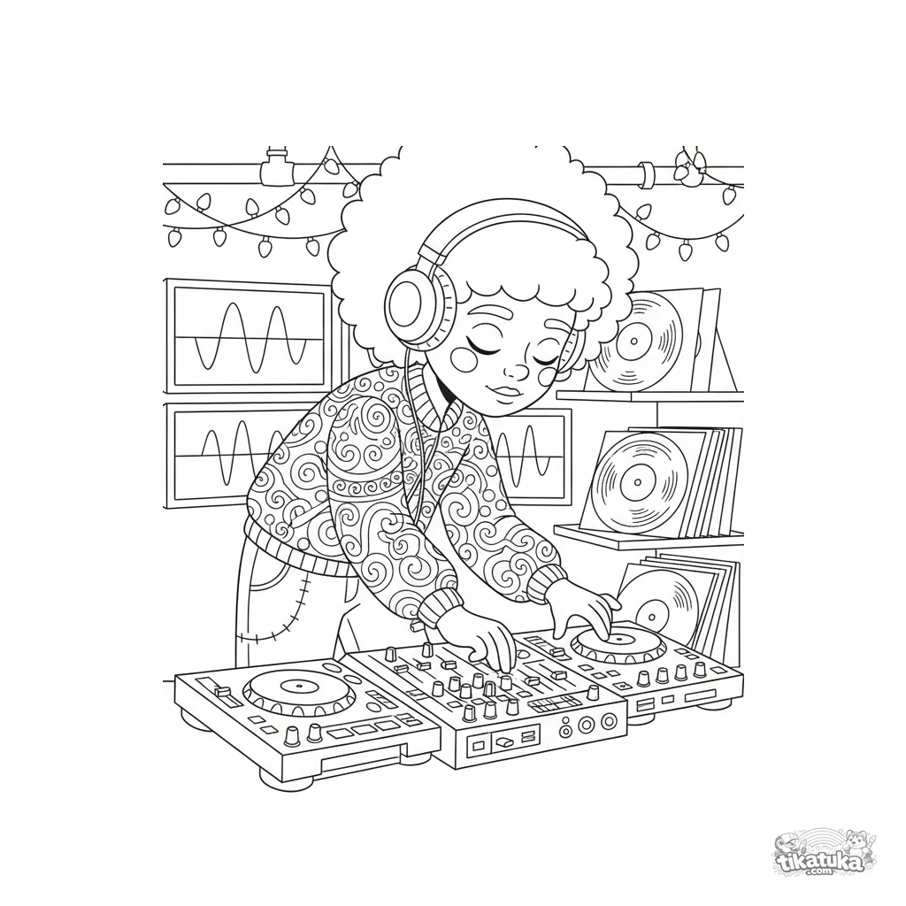 Página para colorear para niños de 10-12 años: un DJ productor mezclando pistas en su estudio del sótano, rodeado de sintetizadores, discos de vinilo y pantallas parpadeantes.