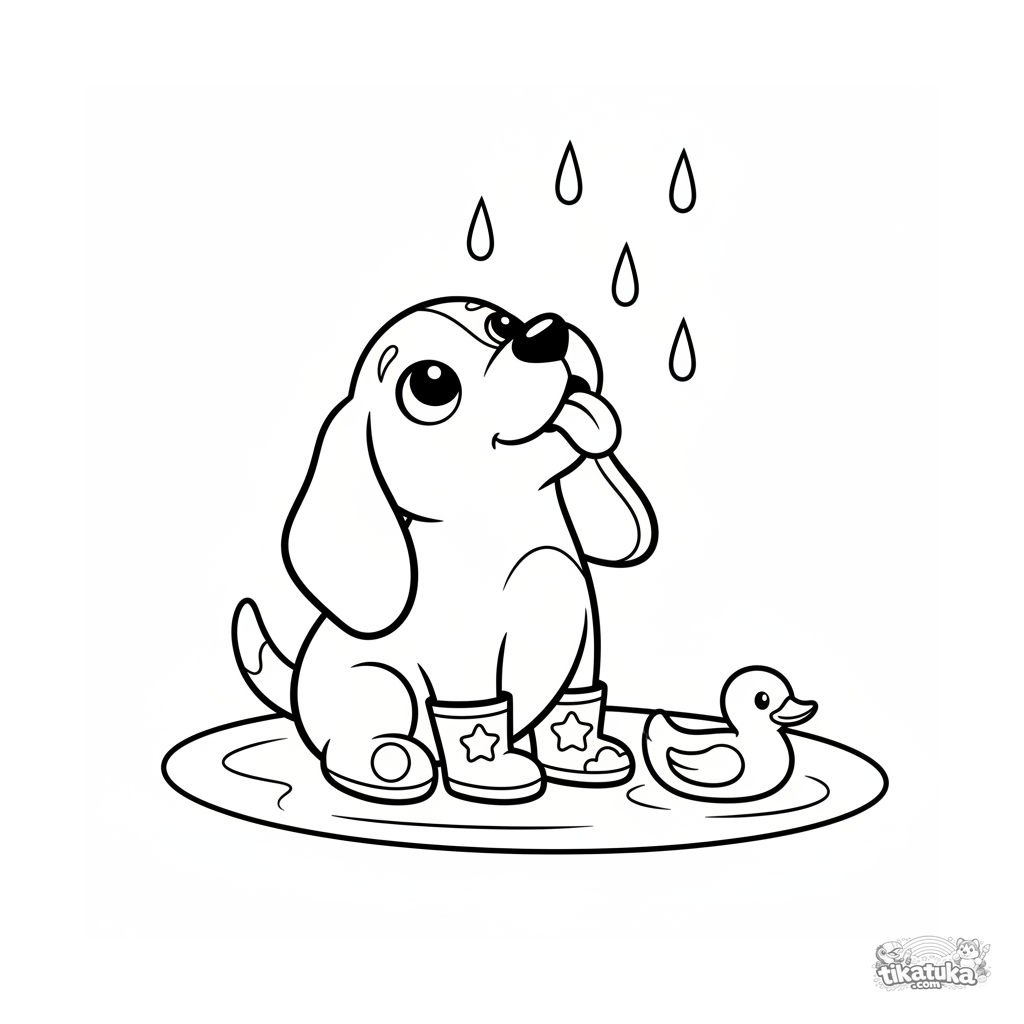 Página para colorear para niños de 2-3 años: un cachorro alegre con botitas se sienta en un charco atrapando gotas de lluvia con la lengua. Formas muy simples y grandes.