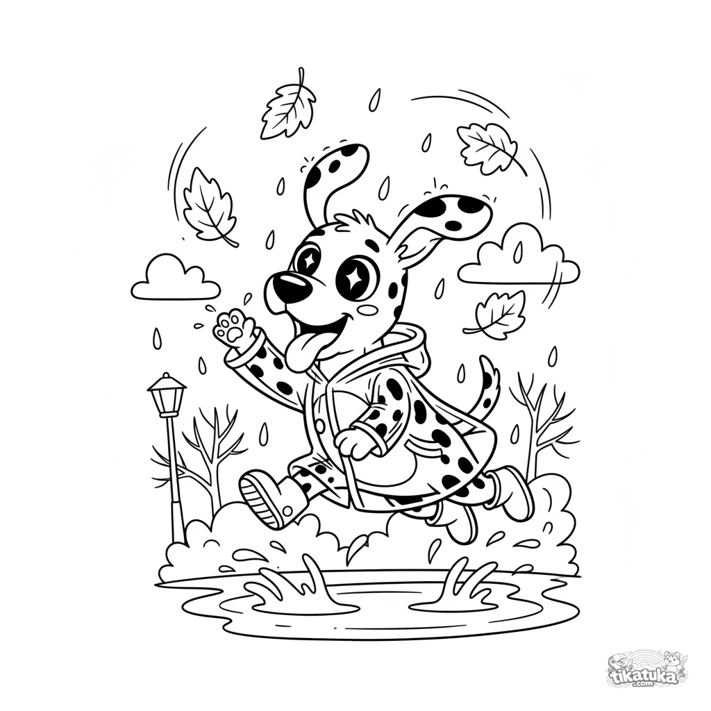 Página para colorear para niños 7-9: un perro alegre con impermeable persigue hojas que caen en un charco bajo la lluvia otoñal.