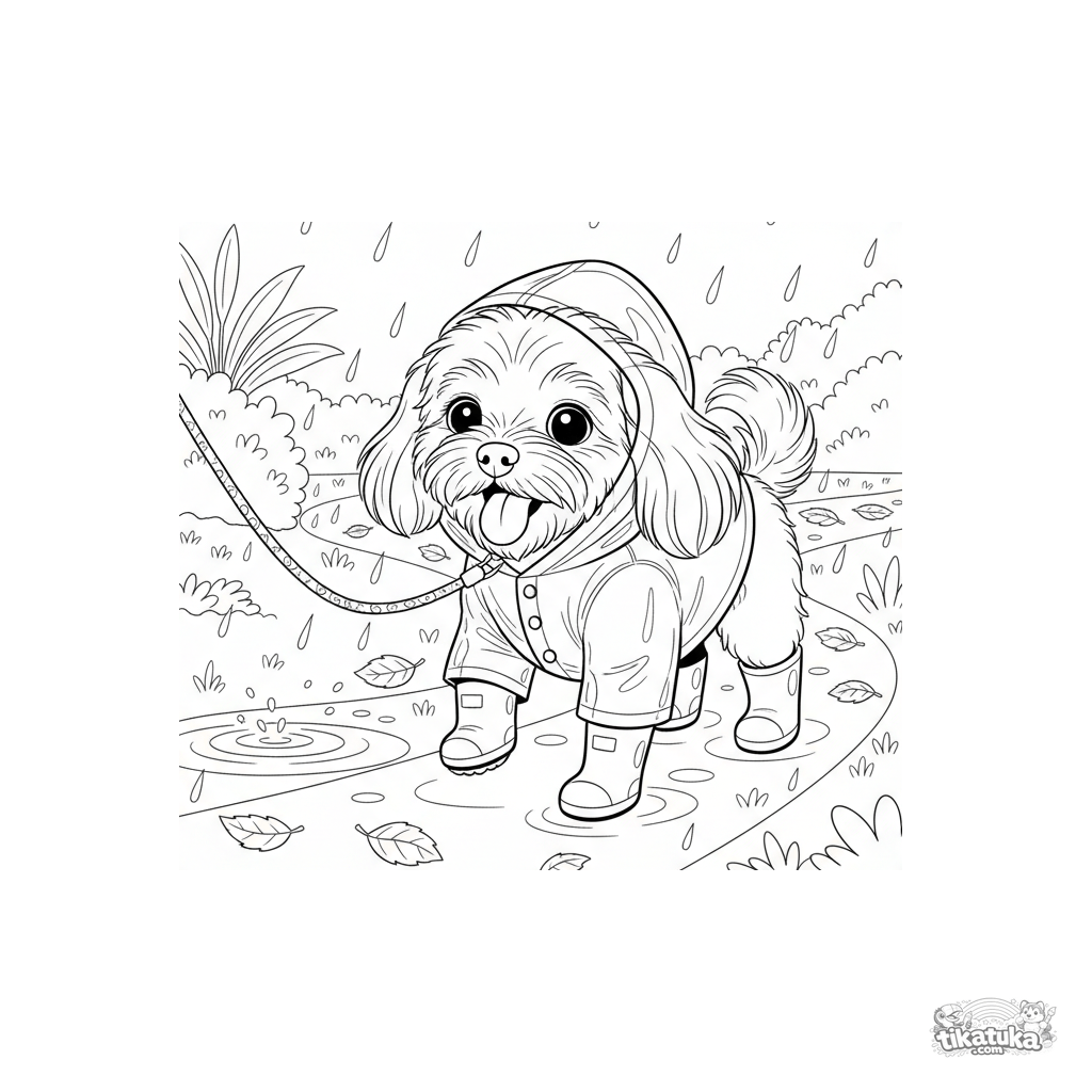 Página para colorear para 7-9 años: un perro esponjoso con impermeable y botas pasea por un camino mojado bajo la lluvia otoñal entre hojas.
