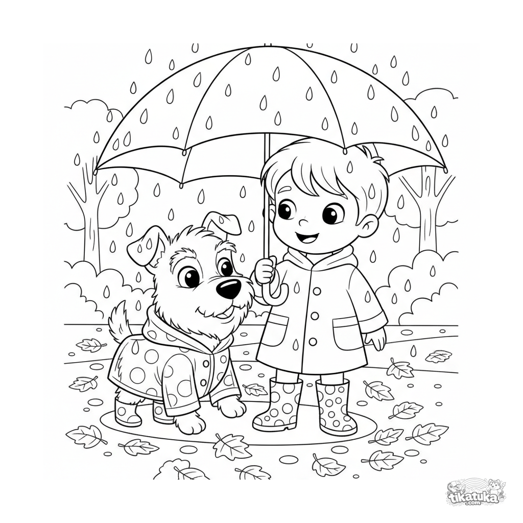 Página para colorear detallada para niños mayores de 10-12 años: un terrier esponjoso con impermeable transparente y botas pasea con un niño bajo un paraguas en un parque otoñal. Conmovedora escena de amistad y clima otoñal.