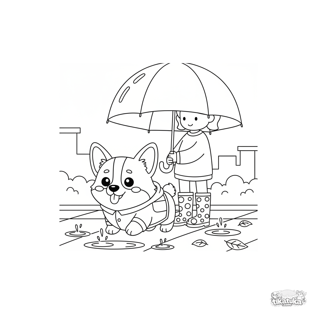 Página para colorear para niños de 4-6 años: un corgi esponjoso con impermeable pasea con su dueño bajo un gran paraguas en un día lluvioso de otoño.