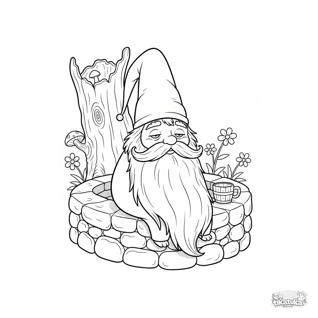 Página para colorear para niños 4-6: un espíritu domovoi se ha quedado dormido en el borde del pozo de agua viva. Estilo de marioneta suave, escena folclórica acogedora.
