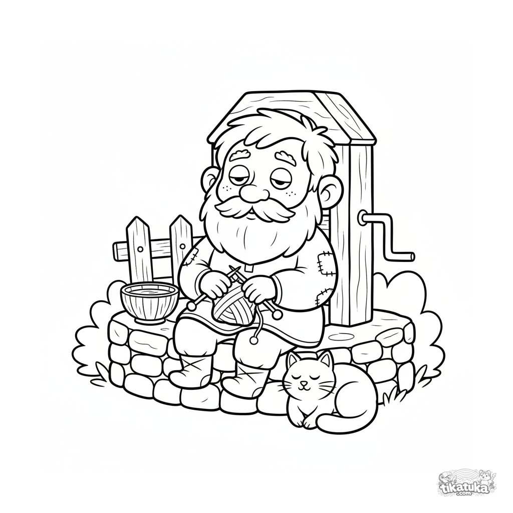 Página para colorear para preadolescentes 7-9: un domovoy amigable durmiendo la siesta junto al pozo de agua viva. Estilo de juguete de madera, escena acogedora.