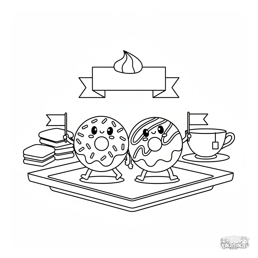 Página para colorear de un dúo de donas marchando en un plato de postre. Para niños de 4 a 6 años. Con chispas, glaseado, banderillas y un banner de crema.
