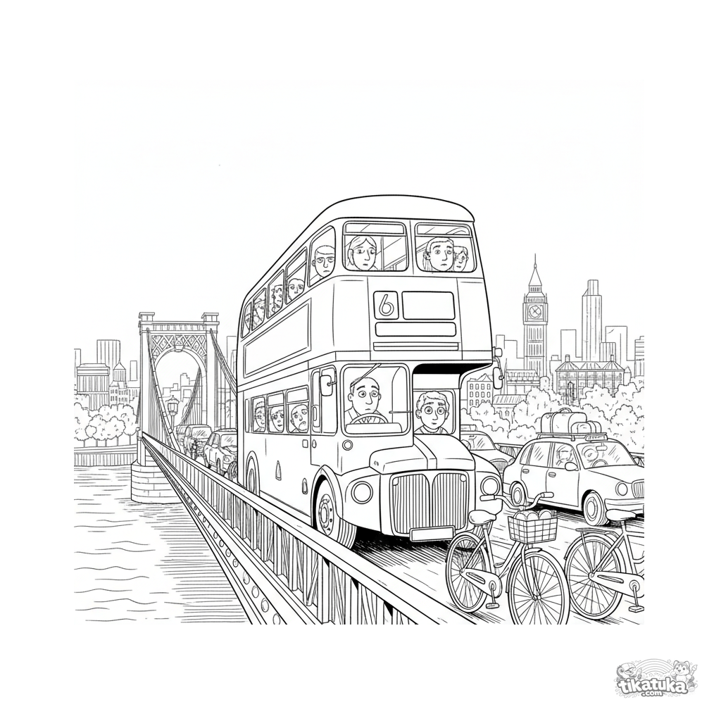 Página detallada para colorear de un autobús de dos pisos en tráfico en un puente ciudad. Para niños mayores 10-12.