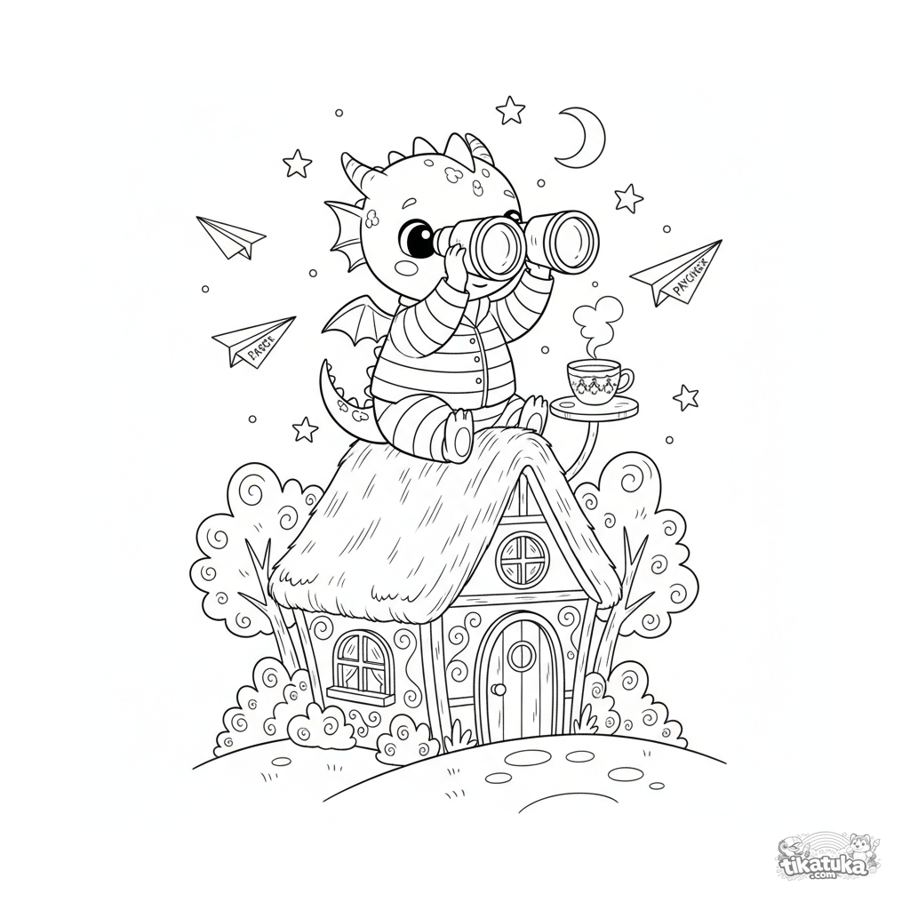 Página para colorear para niños 10-12: un pequeño dragón en pijama a rayas se sienta en un tejado, usando prismáticos para escanear el cielo nocturno en busca de un avión de papel con sueldo.