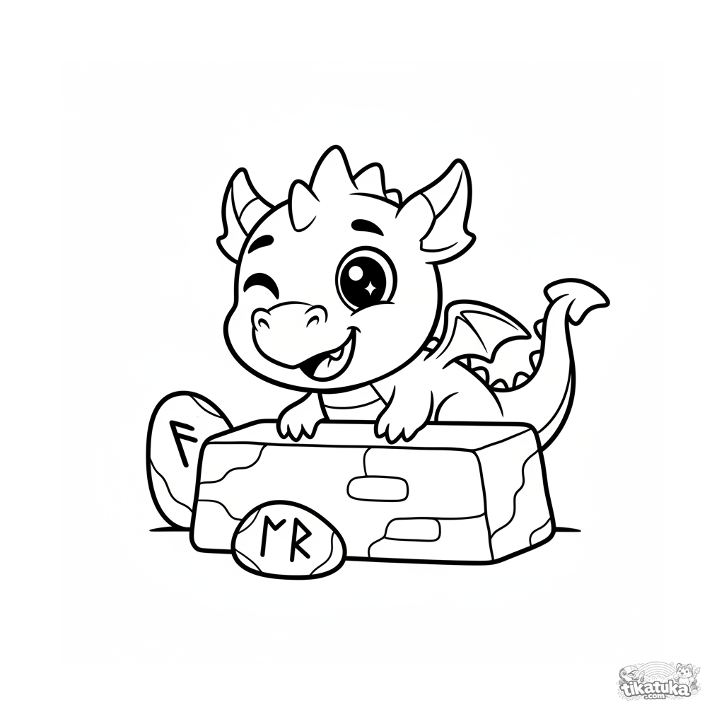 Página para colorear para niños pequeños: un torpe bebé dragón juega al escondite entre antiguas piedras rúnicas. Formas muy simples y grandes.