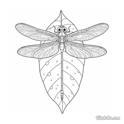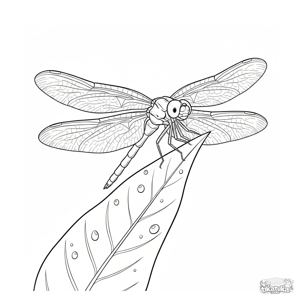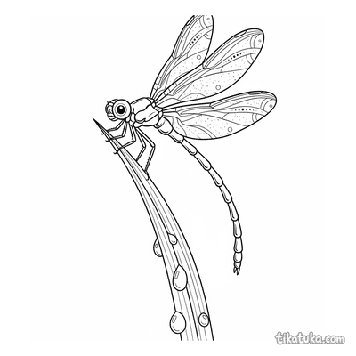 Página para colorear intrincada estilo grabado: una libélula grácil con alas con patrones descansa en la punta de una hoja con gotas de rocío.
