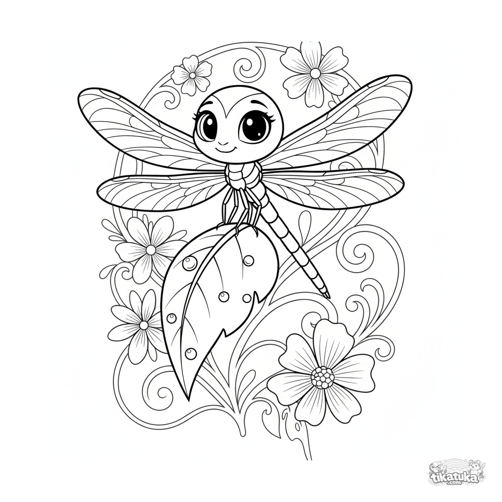 Página para colorear para preadolescentes de 7-9 años: una libélula grácil se posa en la punta de una hoja con rocío.