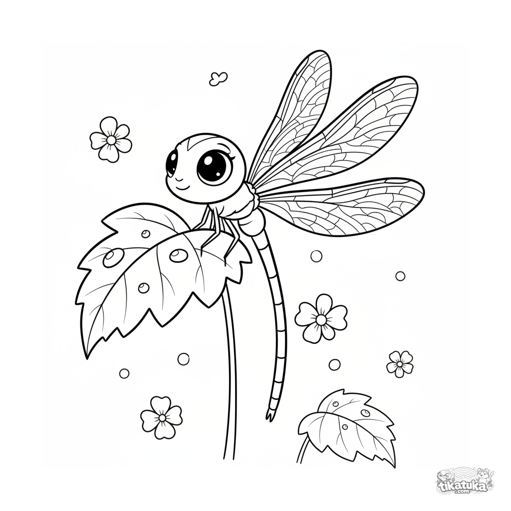 Página para colorear para preadolescentes de 7-9 años: una libélula grácil descansa en el tallo de una hoja con rocío. Estilo acuarela, líneas fluidas, pose expresiva.