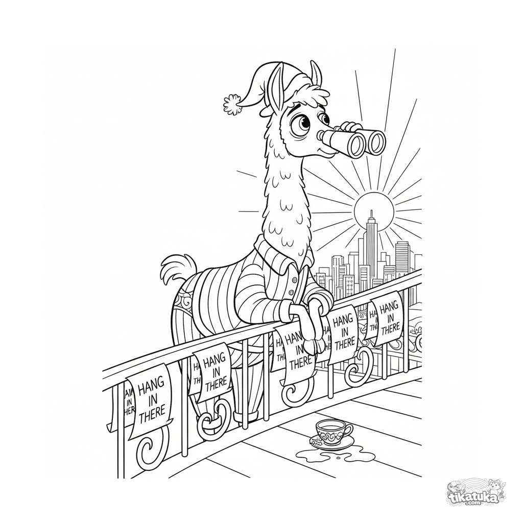 Página para colorear para niños 10-12: una llama agotada y dramática en pijama en un balcón con prismáticos, mirando el amanecer.