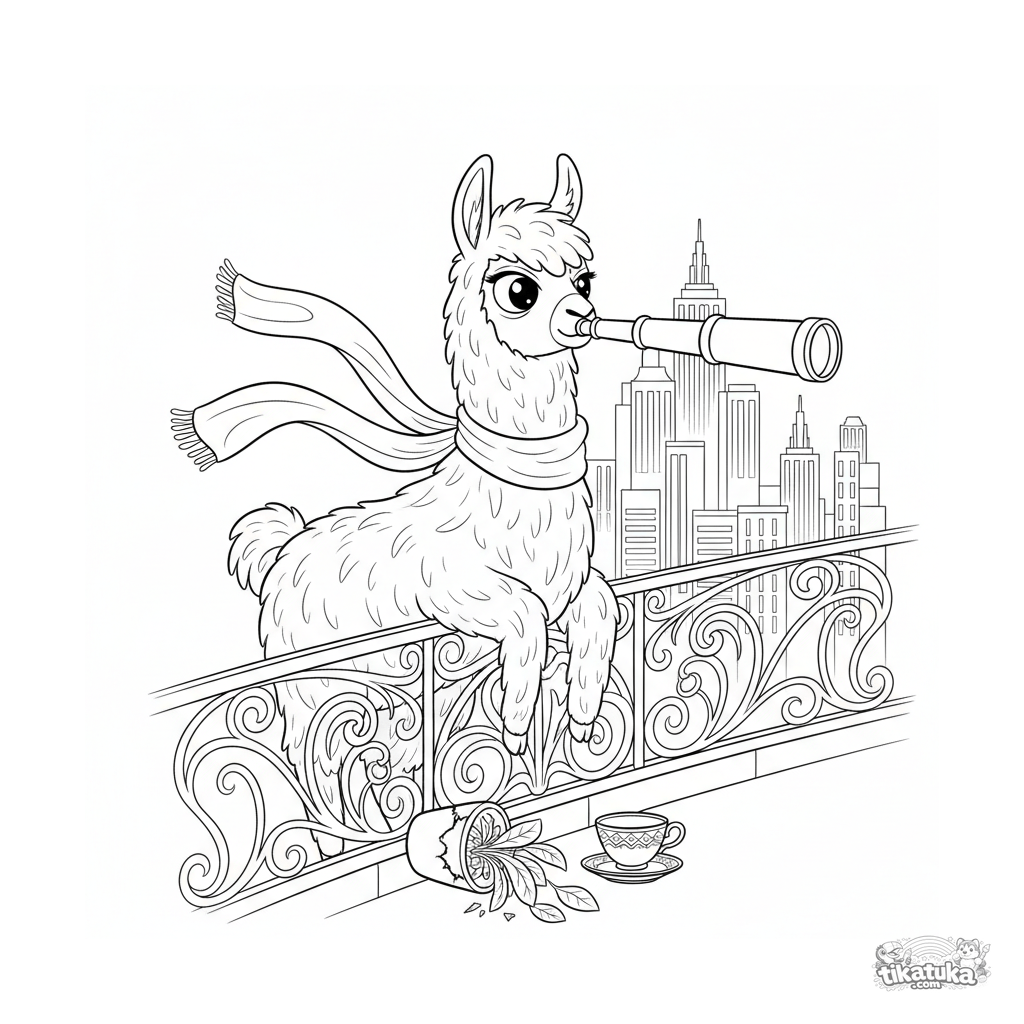 Página para colorear detallada en estilo Art Nouveau: una llama dramática con pañuelo busca su salario con un catalejo en un balcón. Meme complejo con paisaje urbano para niños 10-12.