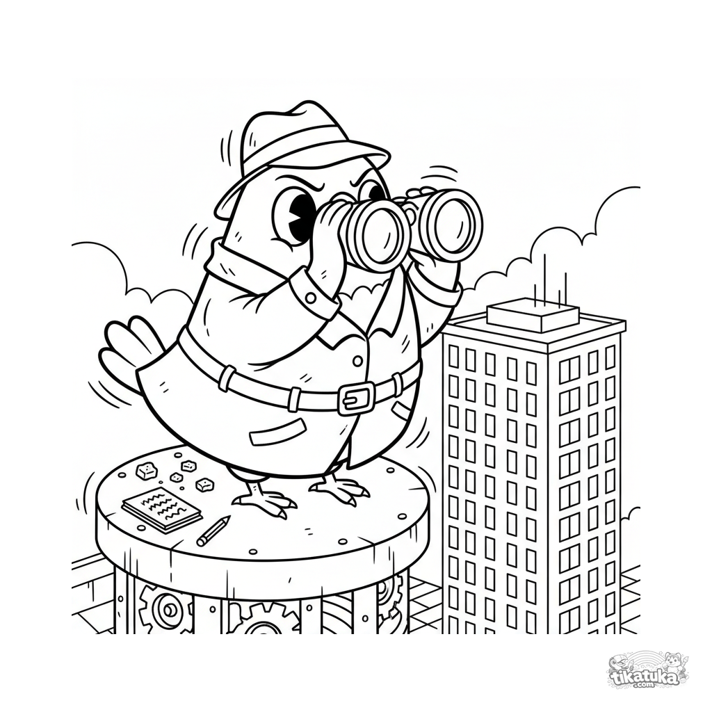 Página para colorear para niños 10-12: una paloma detective dramática en una azotea de oficina, mirando con prismáticos. Escena de meme divertida con detalles.