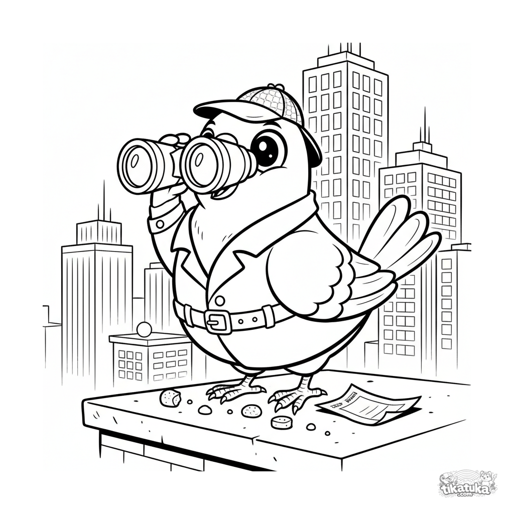 Página para colorear para niños 10-12: una paloma detective dramática en una azotea escanea el horizonte con prismáticos. Escena de meme divertida con fondo urbano detallado.