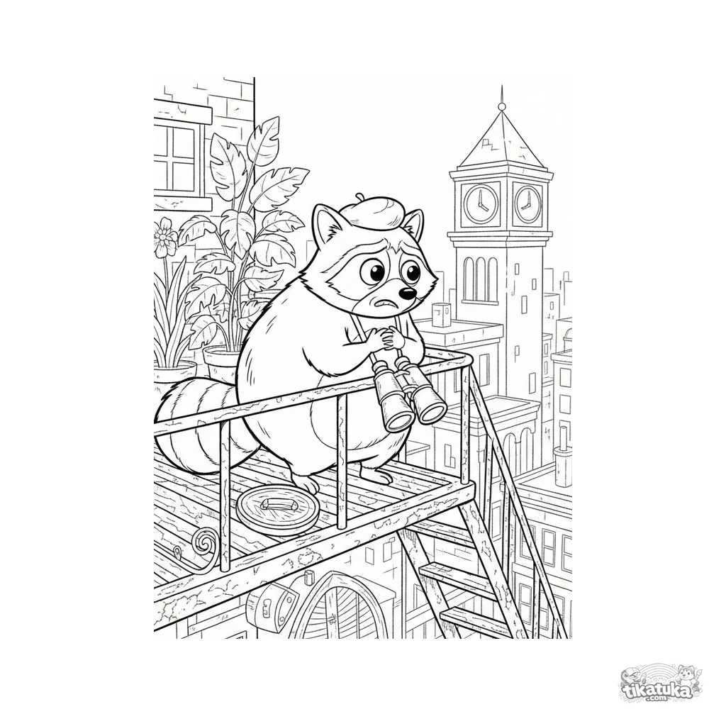 Página para colorear para niños mayores: un mapache dramático con boina en una escalera de incendios con prismáticos, mirando con nostalgia el reloj de un banco. Escena urbana graciosa detallada.