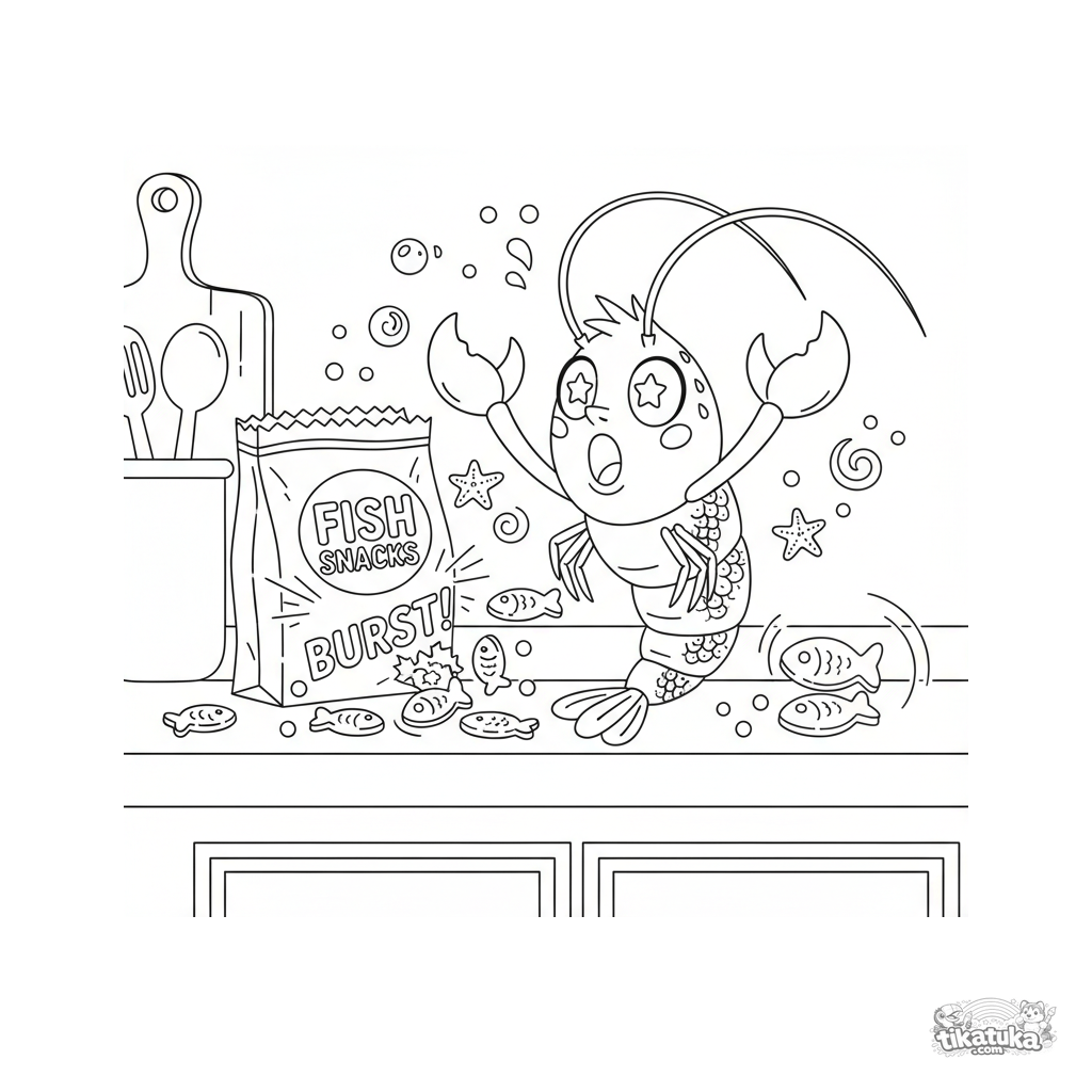 Página para colorear para niños 7-12: un camarón dramático reacciona exageradamente a bocadillos derramados. Escena de reacción divertida al estilo manga.