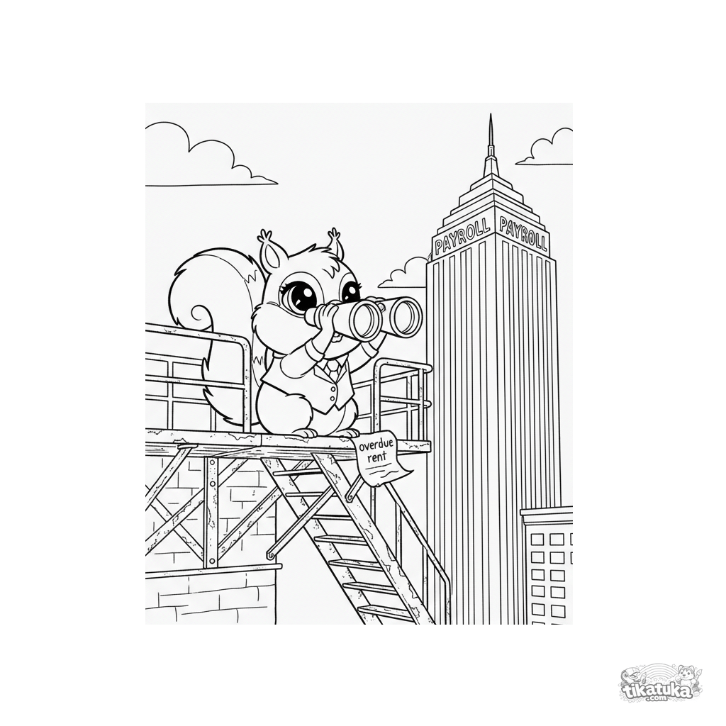 Página para colorear para niños 10-12: una ardilla dramática en un vestido en una escalera de incendios, mirando con binoculares su pago. Escena de meme divertida con detalles de edificio de oficinas.