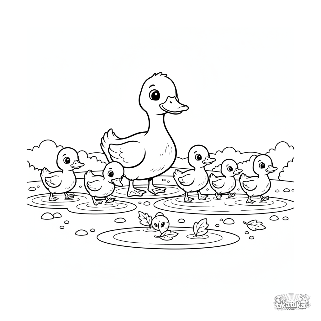 Página para colorear para 7-9 años: una pata madre guía una fila de patitos esponjosos por un camino de grava mojado con charcos bajo la lluvia otoñal.