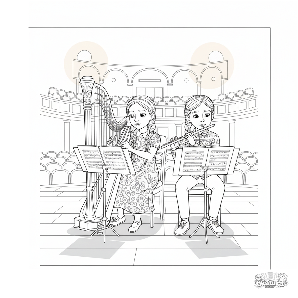 Página para colorear compleja para 10-12 años: un dúo de jóvenes músicos tocando el arpa y la flauta en un gran escenario de sala de conciertos.
