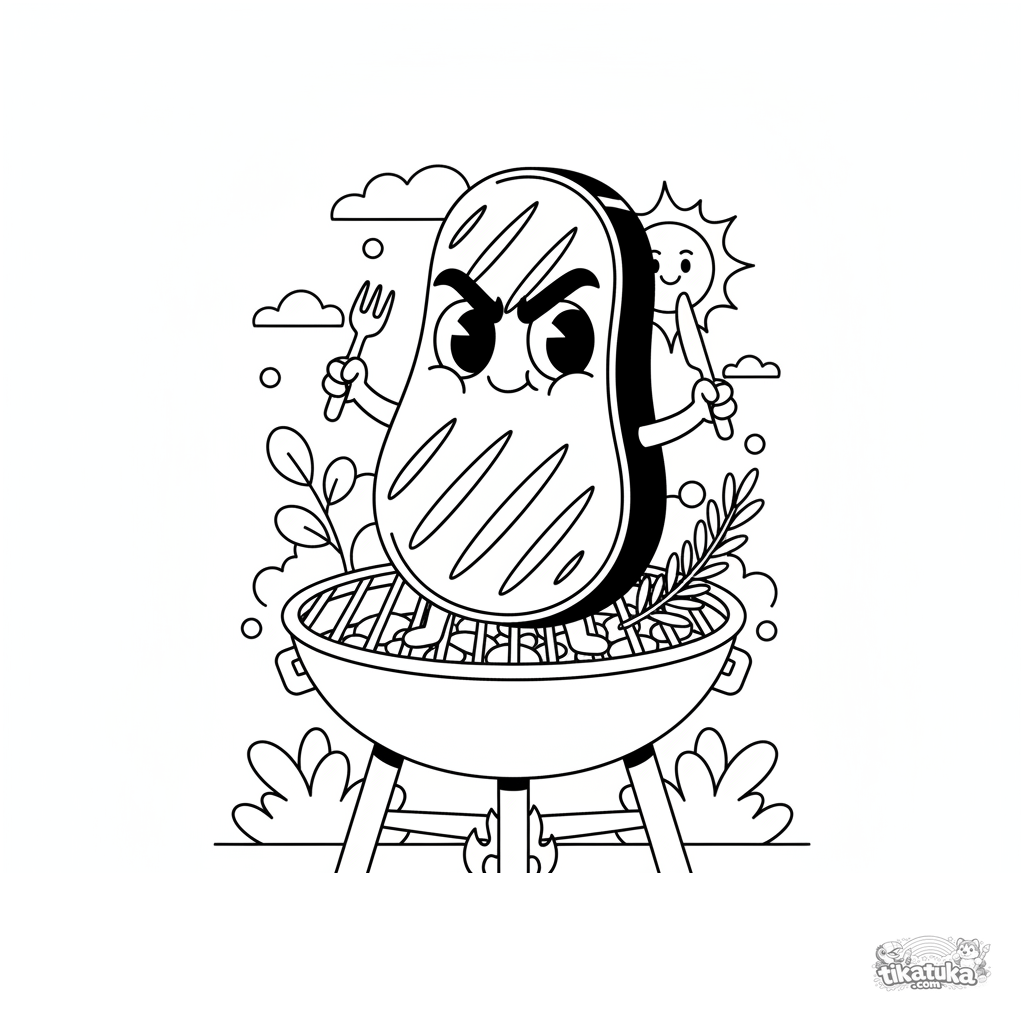 Página para colorear para niños 7-9: una berenjena como filete con cuchillo y tenedor en la parrilla. Estilo cómic dinámico, rasgos expresivos.