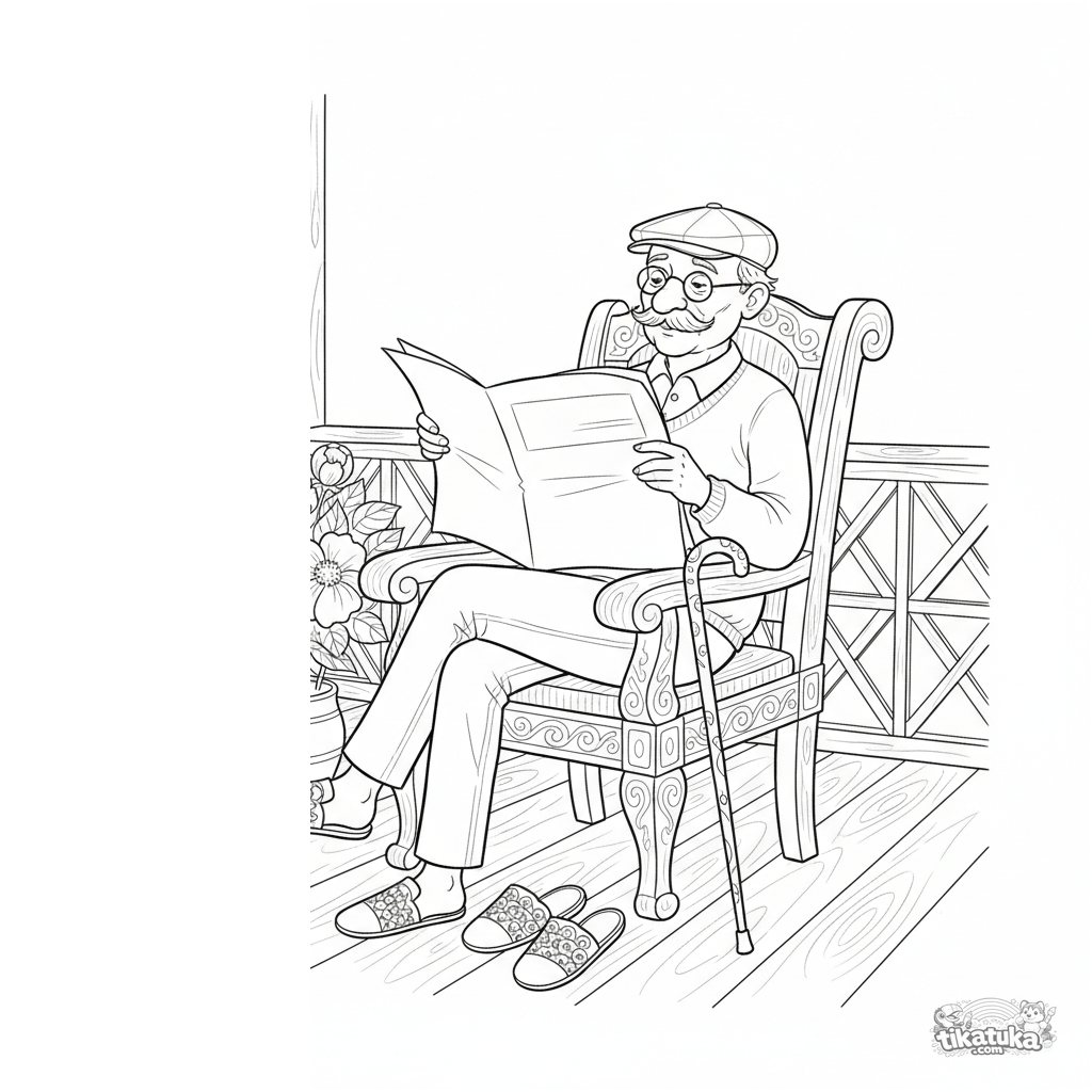 Página detallada para colorear para niños de 10-12 años: un abuelo con gafas lee el periódico en un sillón en el porche.