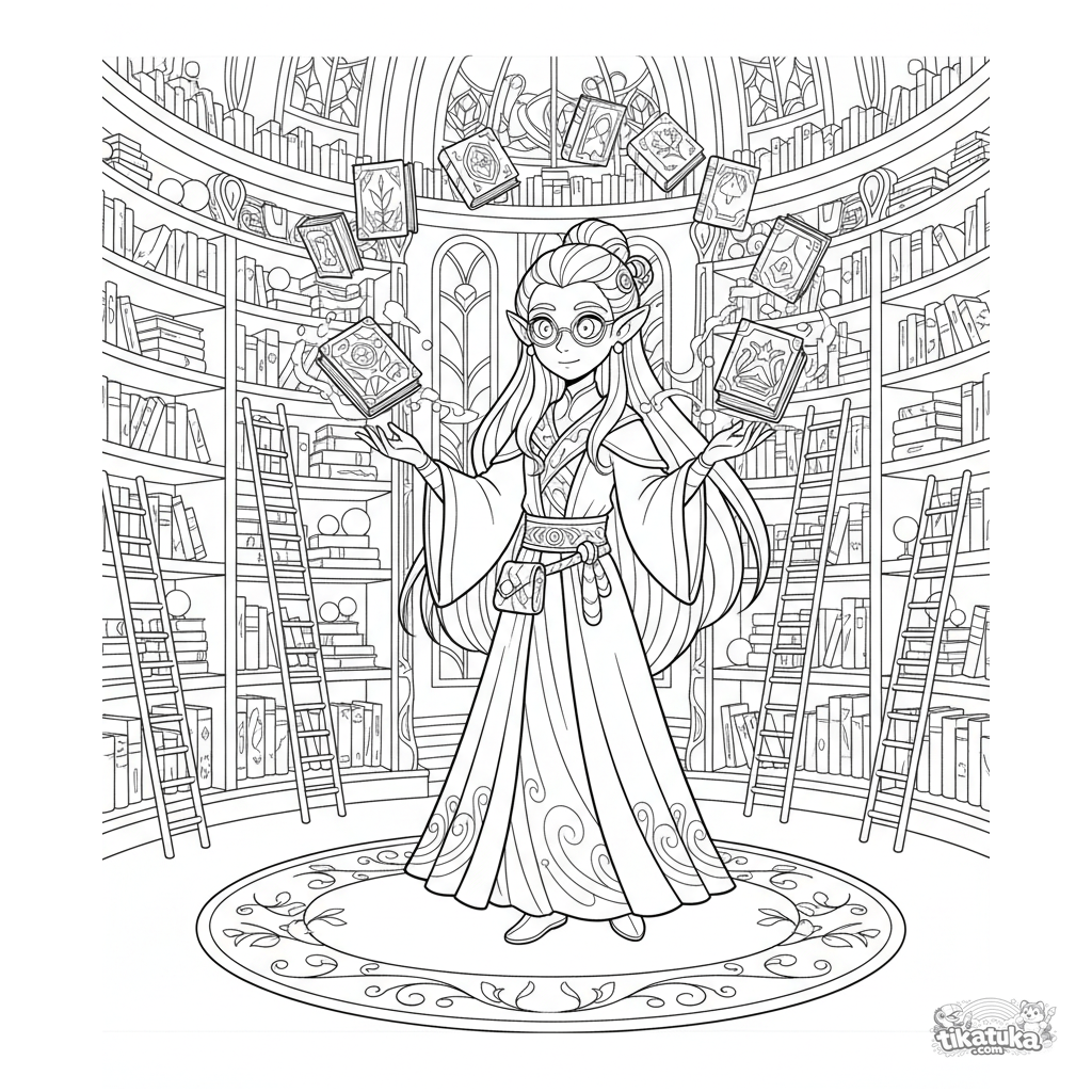 Página para colorear para mayores 10-12: un archivero élfico usa magia para clasificar libros antiguos flotantes en una biblioteca circular. Escena compleja y detallada.