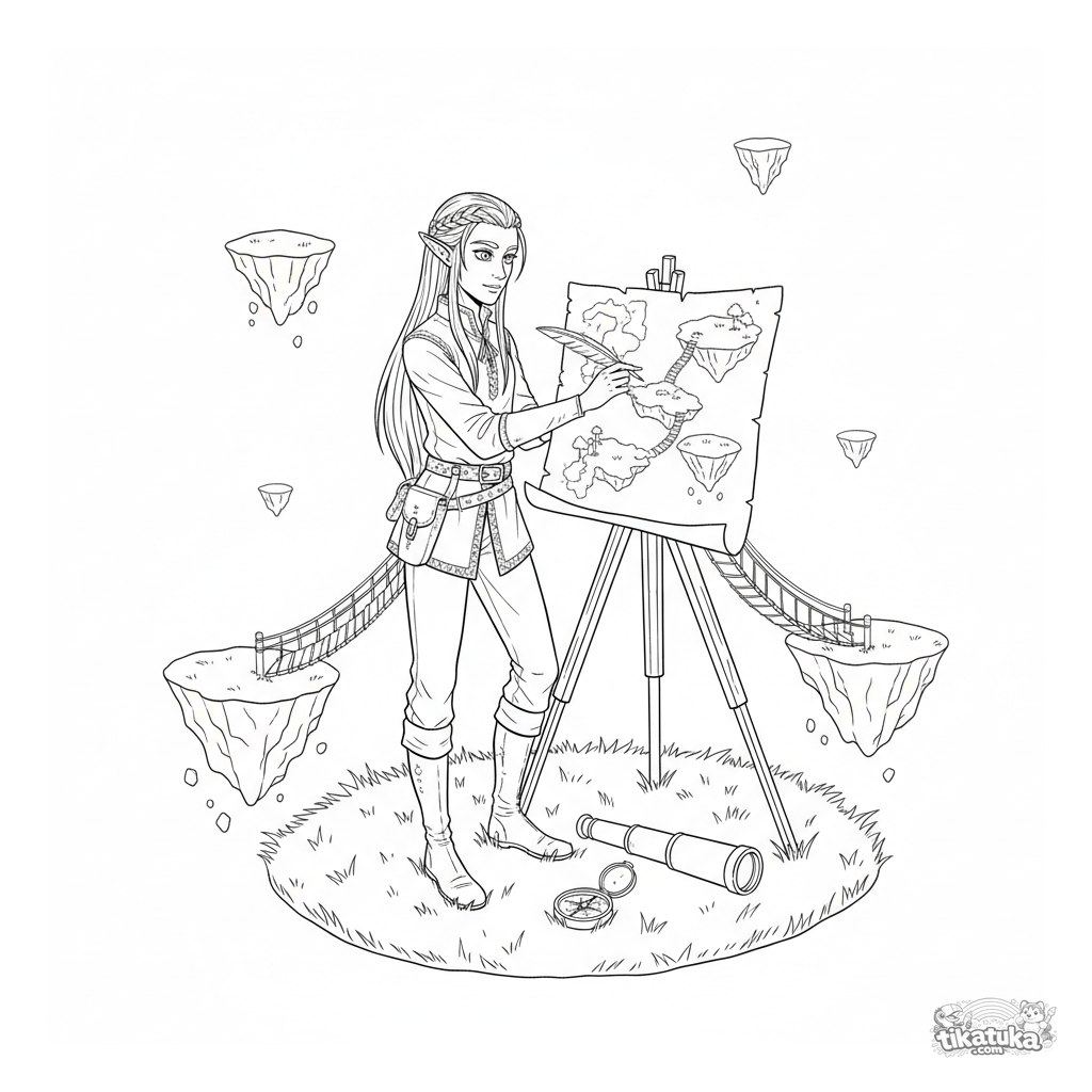 Página para colorear para 10-12 años: un cartógrafo elfo mapea meticulosamente una cadena de islas flotantes. Escena detallada en estilo fantasía de guía de campo.