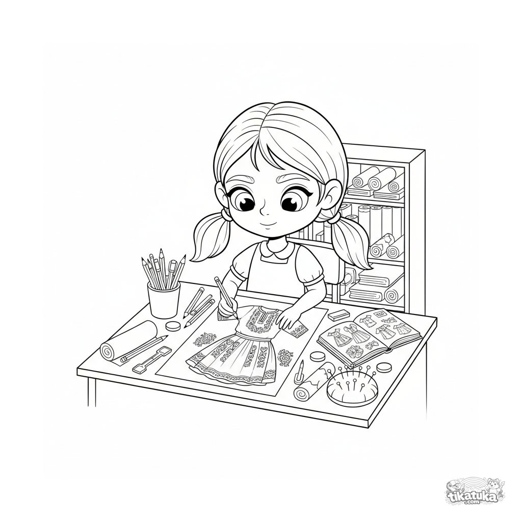 Página para colorear creativa para 10-12 años: niña diseñando boceto traje folk en su escritorio. Estilo doodle cuaderno, muchos detalles del proceso creativo.