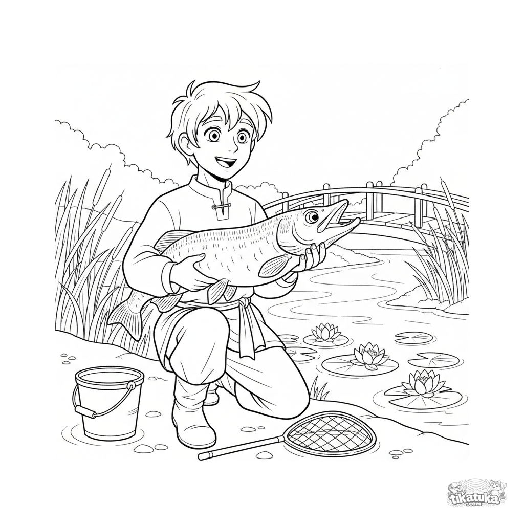 Página para colorear para niños de 4-6: Emelya en la orilla del río sostiene el lucio mágico que concederá sus deseos. Escena clave del cuento.