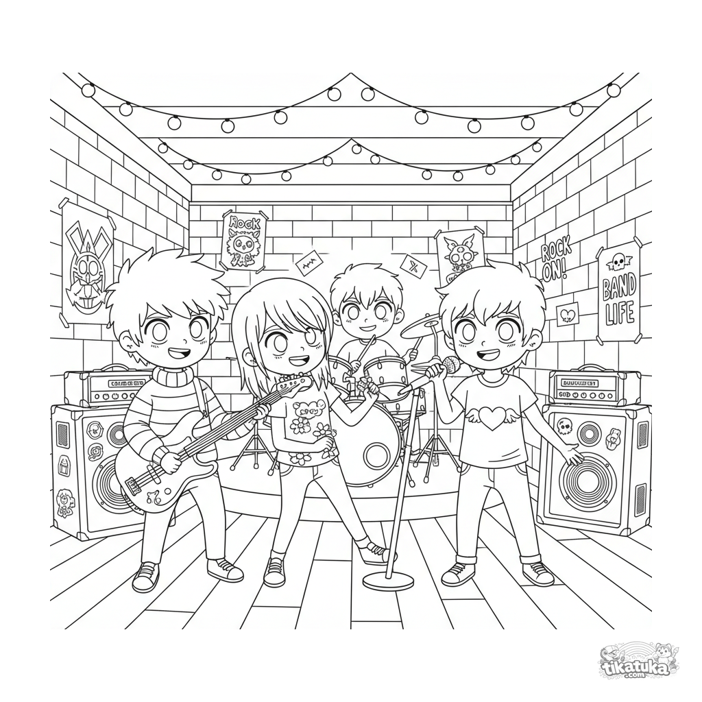 Página para colorear para niños de 7-12 años: una banda emo-lite de cuatro miembros ensayando en un sótano de club musical con instrumentos y luces.