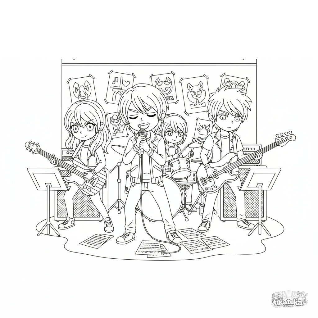 Página para colorear para niños de 7 a 12 años: una banda emo-lite ensaya en un club de música acogedor. Muchos detalles: instrumentos, carteles, partituras. Escena para colorear con paciencia.