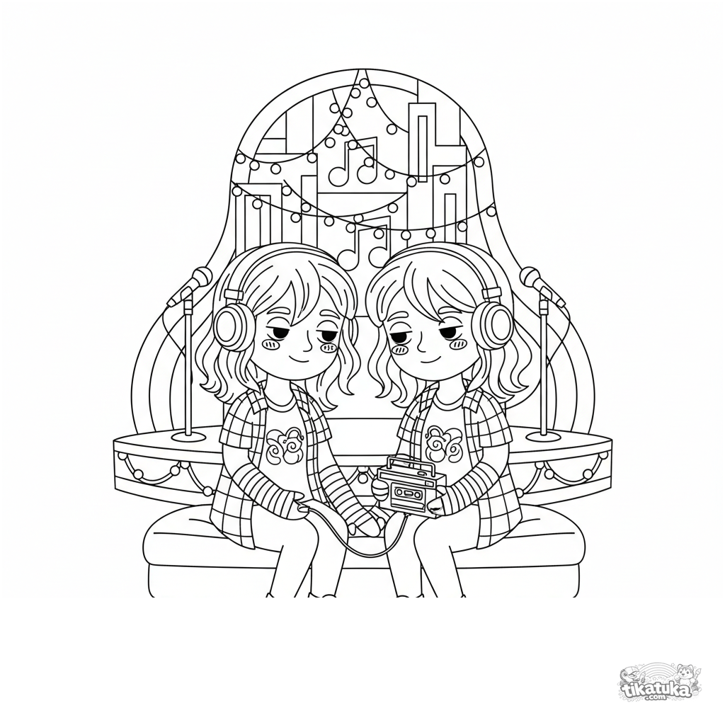 Página para colorear para niños de 7-12 años: dos amigos con estilo emo-lite relajándose en un club de música. Escena detallada con escenario, luces y reproductor.