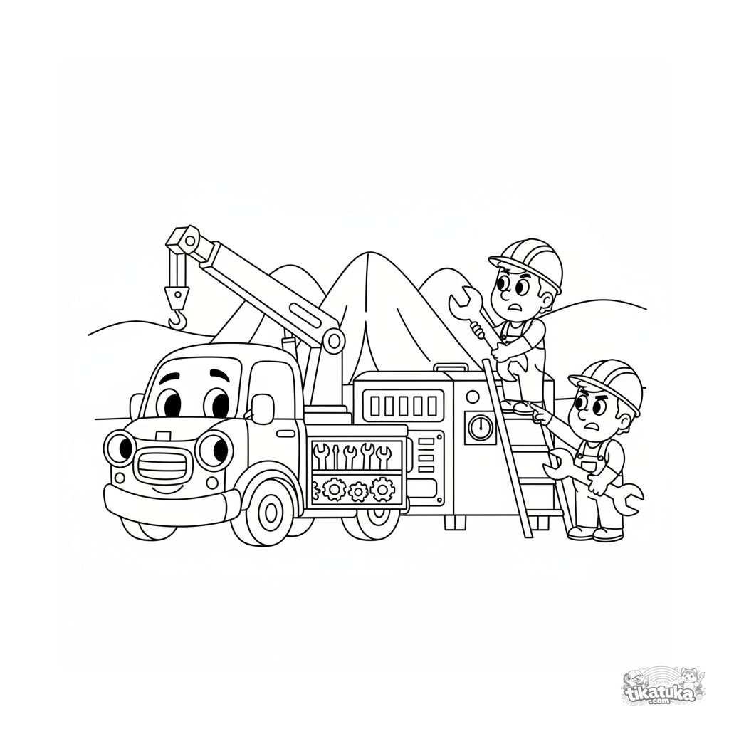Página para colorear para niños 7-9: un camión de reparación con grúa ayuda a ingenieros a arreglar un generador de campo cerca de carpas. Gabinete de herramientas abierto.