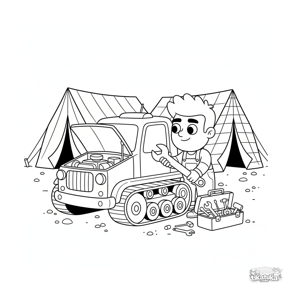 Página para colorear detallada para niños 10-12: un ingeniero repara un pequeño vehículo de orugas en el área de mantenimiento del cuartel. Estilo cómic dinámico.