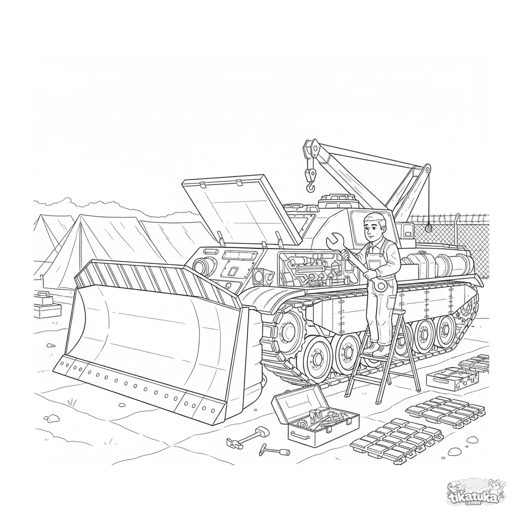 Página para colorear compleja para 10-12 años: un tanque de ingenieros detallado con pala bulldozer y grúa en reparación.